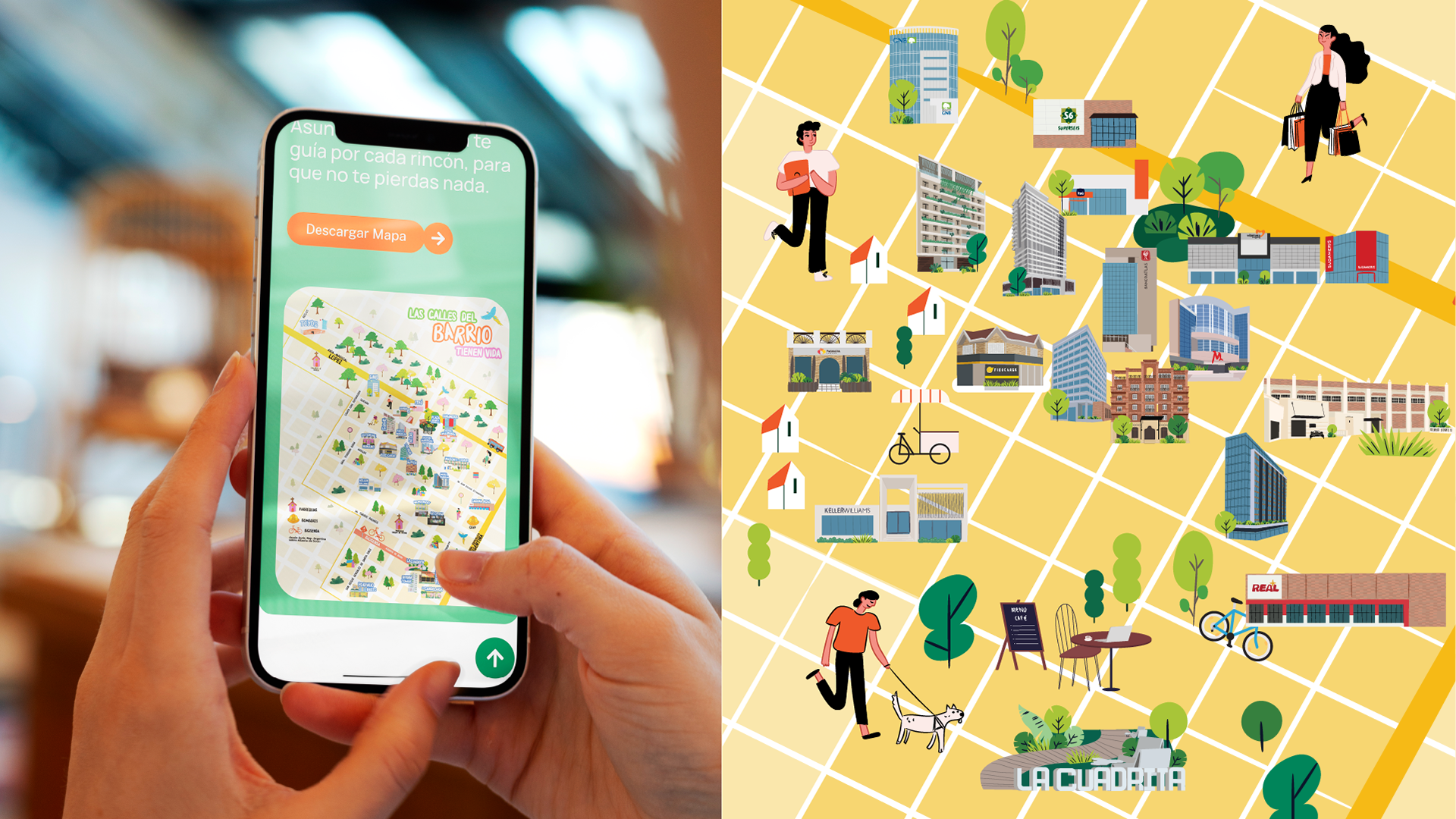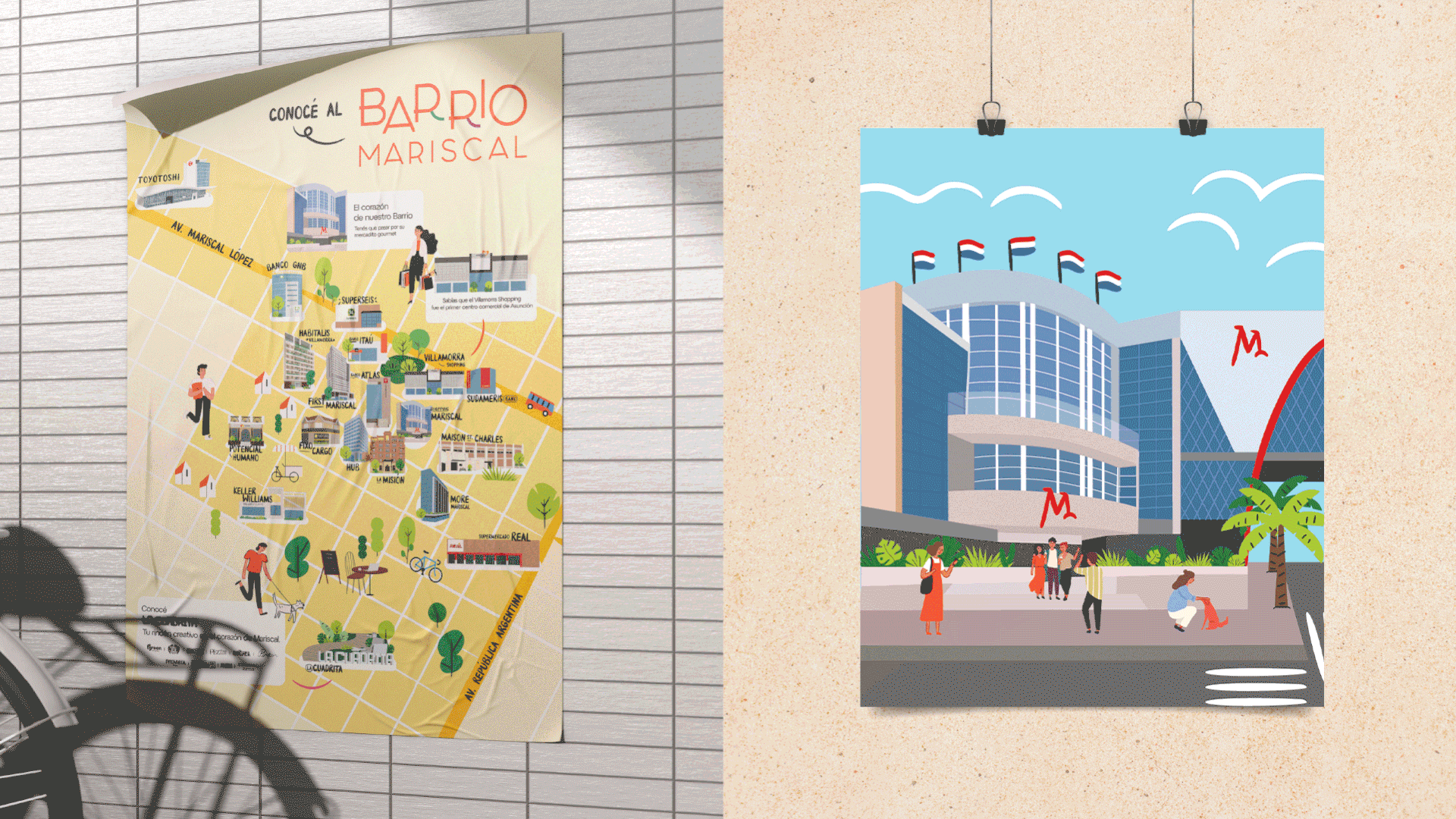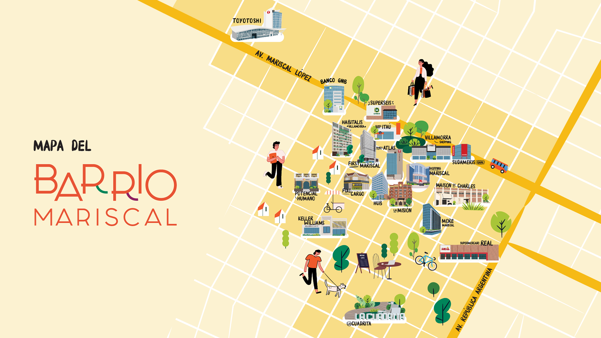 Proyecto de ilustración y diseño editorial desarrollado para el Mapa del Barrio Mariscal, una herramienta de comunicación urbana pensada para fortalecer la visibilidad de las marcas socias y poner en valor la vida del barrio. El proyecto se concibió en dos versiones complementarias: un mapa de socios, donde cada marca cuenta con una ilustración propia y ubicación destacada, y un mapa general que incorpora puntos de interés, espacios comerciales y referencias de uso cotidiano. A través de un lenguaje visual claro, amable y narrativo, el mapa busca facilitar la orientación tanto en formatos digitales como físicos, reforzando el sentido de pertenencia y la experiencia de residentes y visitantes.