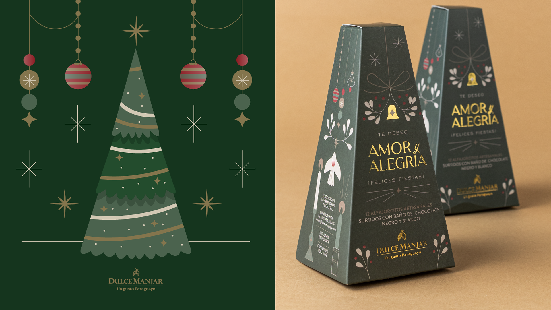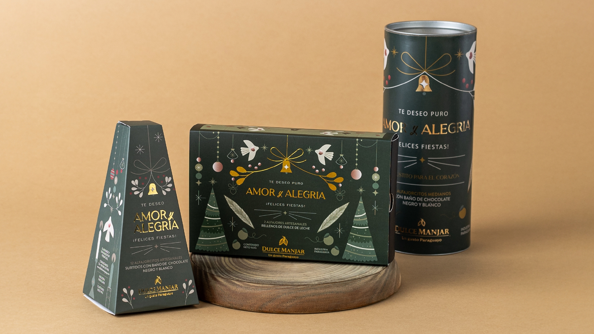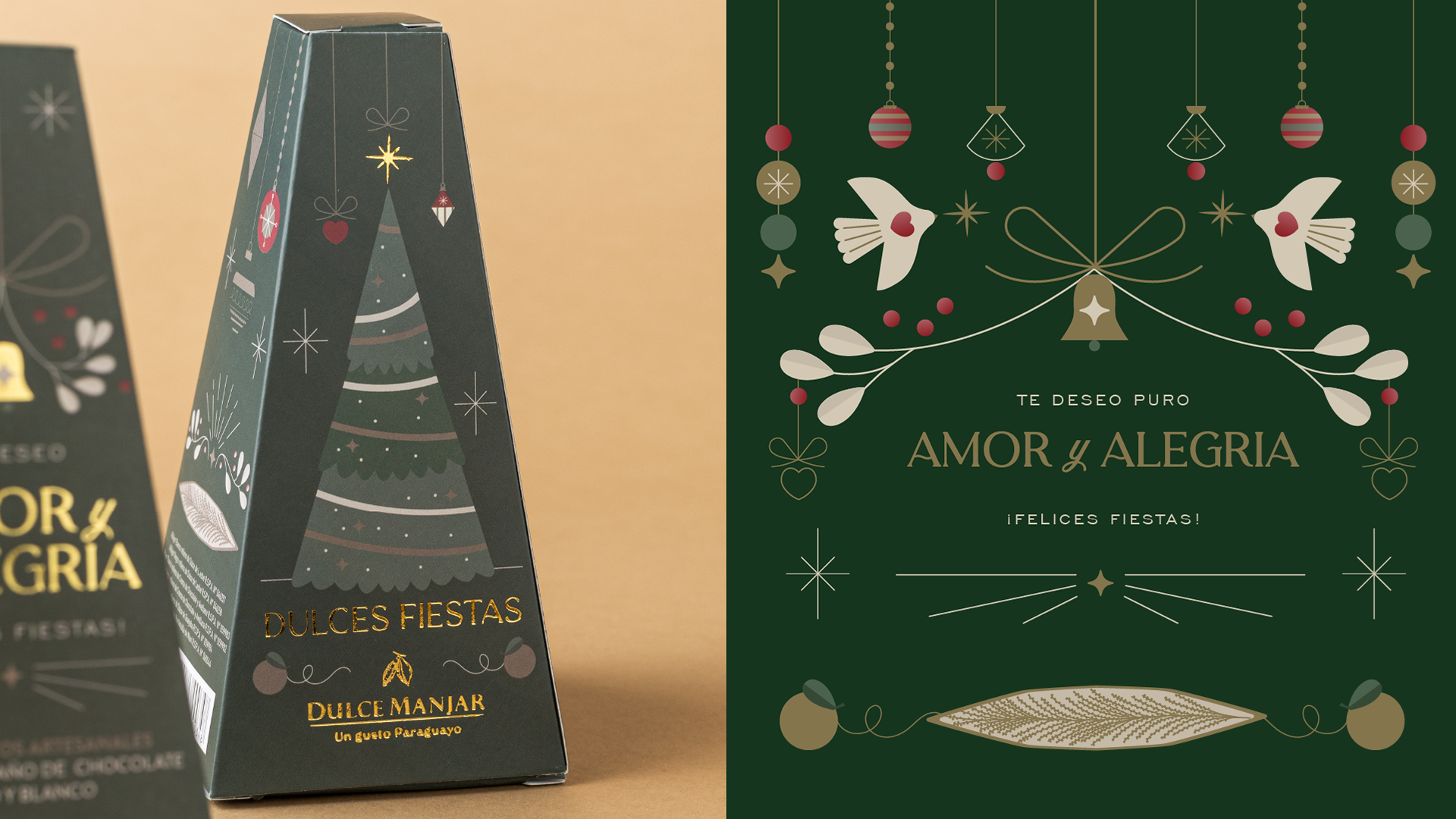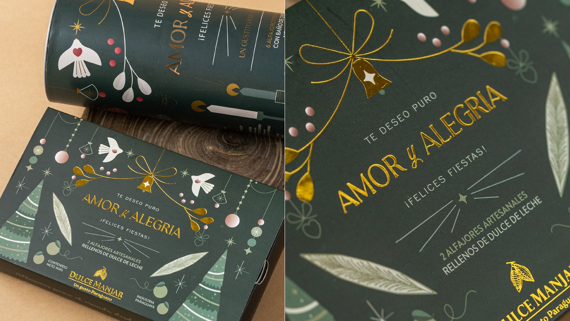 La propuesta se desarrolló para una edición navideña, construyendo un universo visual que celebra el amor, la alegría y el encuentro. A través de ilustraciones originales, una paleta profunda con detalles dorados y una composición cuidada, el packaging busca acompañar el producto desde lo emocional, reforzando la identidad de la marca y transformando cada caja en una experiencia de regalo.
