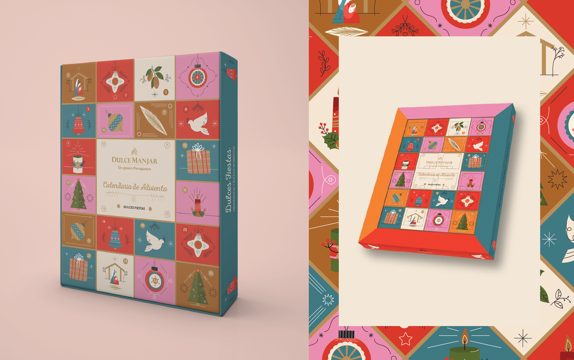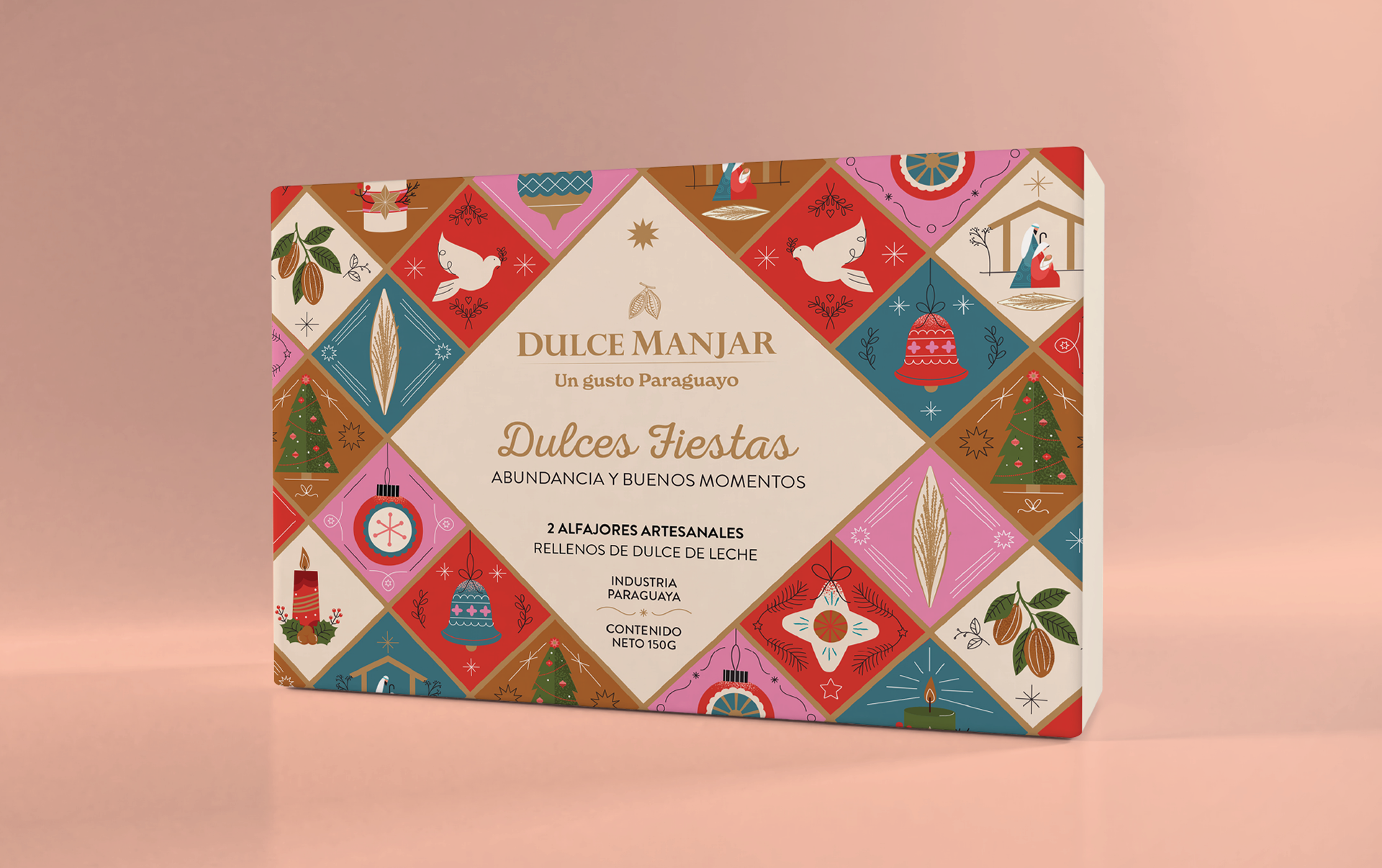 Packaging design project for Dulce Manjar, a Paraguayan artisanal alfajores brand. For the Dulces Fiestas edition, a modular illustrated system was created to celebrate abundance, tradition and shared moments. Through vibrant colors, original illustrations and a dynamic composition, the packaging enhances the emotional value of the product while reinforcing the brand identity with a festive and memorable proposal.