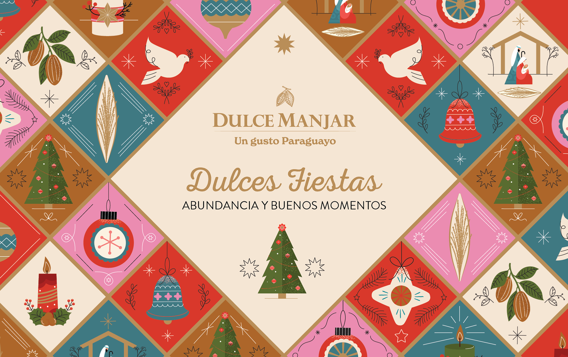 Proyecto de diseño de packaging ilustrado para Dulce Manjar, marca paraguaya de alfajores artesanales. Para la edición Dulces Fiestas, se desarrolló un sistema visual basado en módulos ilustrados que celebran la abundancia, la tradición y los buenos momentos compartidos. A través de una paleta vibrante, ilustraciones originales y una composición dinámica, el packaging busca transmitir calidez y celebración, acompañando el producto desde lo emocional y reforzando la identidad de la marca en una propuesta festiva y memorable.