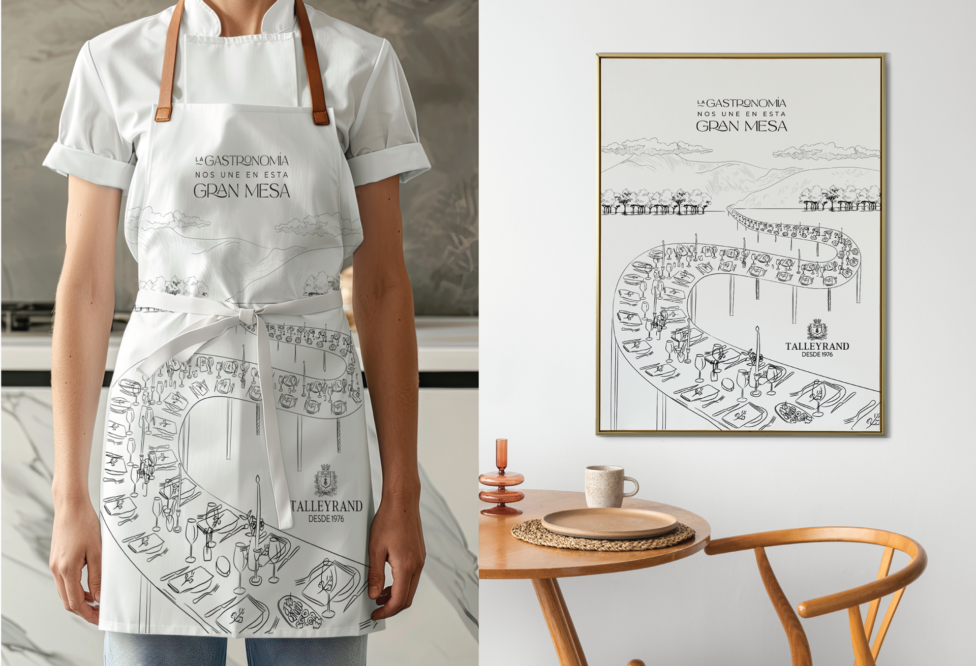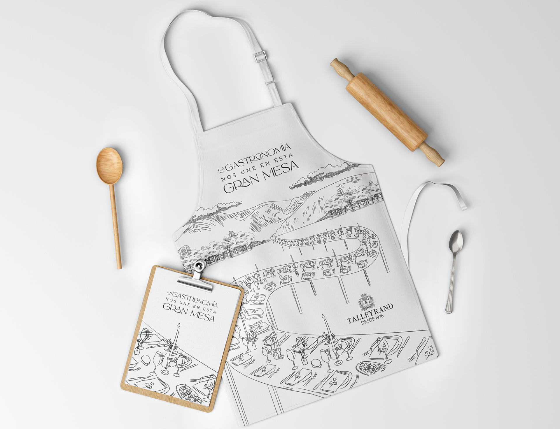 La gastronomía nos une en esta Gran Mesa, donde cada plato cuenta una historia y cada detalle ilustra el arte de compartir. Esta ilustración, diseñada para delantales, celebra la esencia de Talleyrand: tradición, calidad y el placer de reunirnos alrededor de la comida.